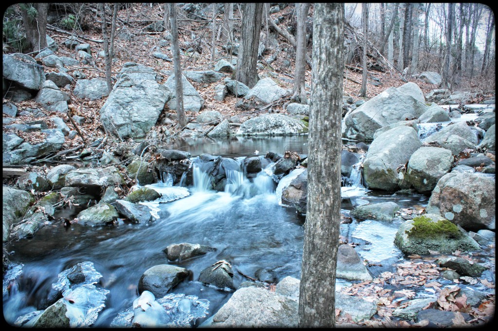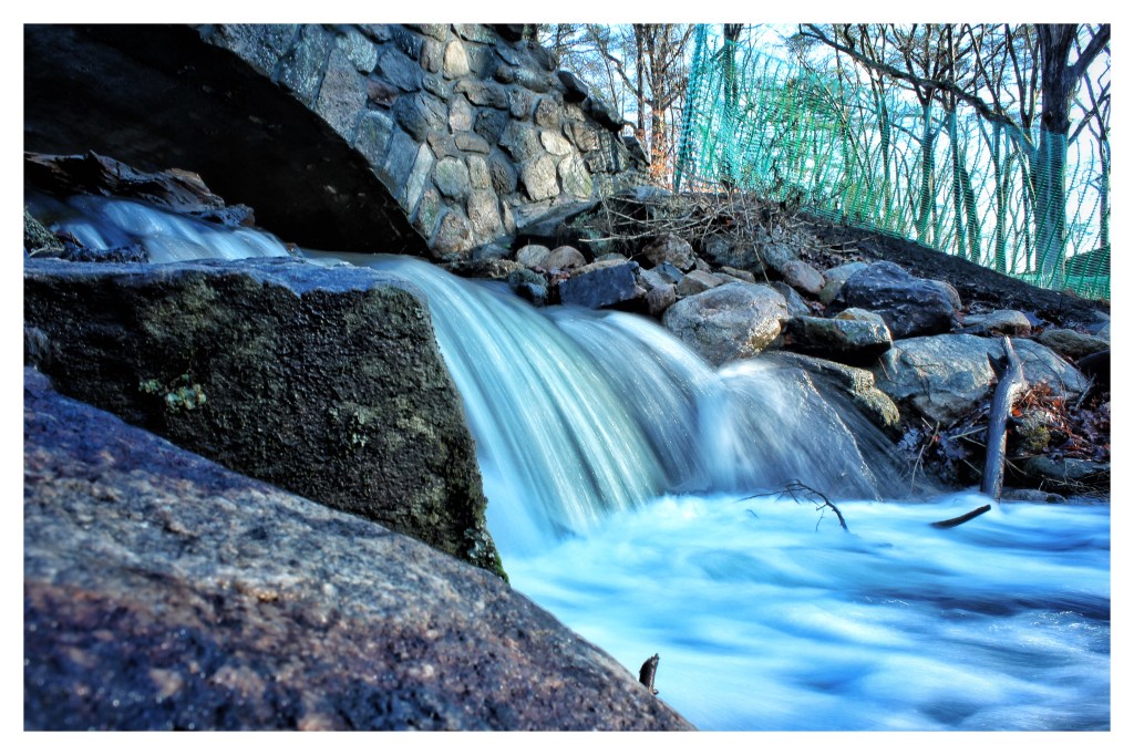More recently I’ve been taking my camera for a walk there to take long-exposure photos of the water running through the brooks and off of Cos Cob Pond. I’ve only recently started taking pictures like this so, though I love the results so far, I know I’ve a bit to learn about setting the right shutter speed, aperture and selecting the best ISO setting (that digital cameras have an ISO setting is still baffling to me, but I understand it).