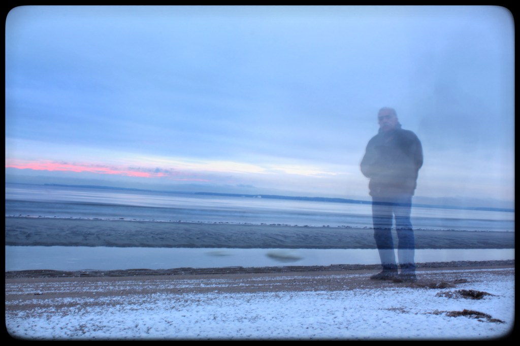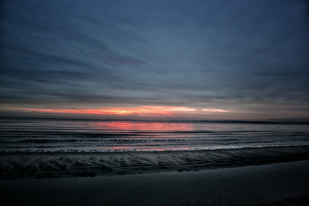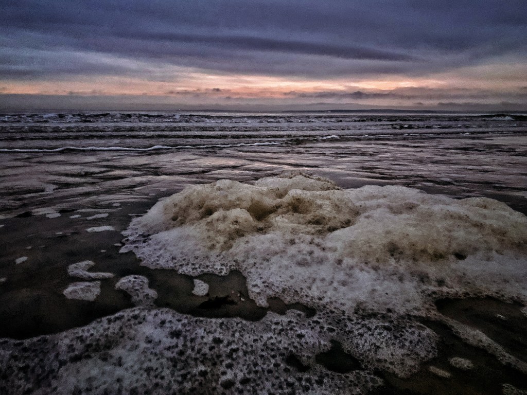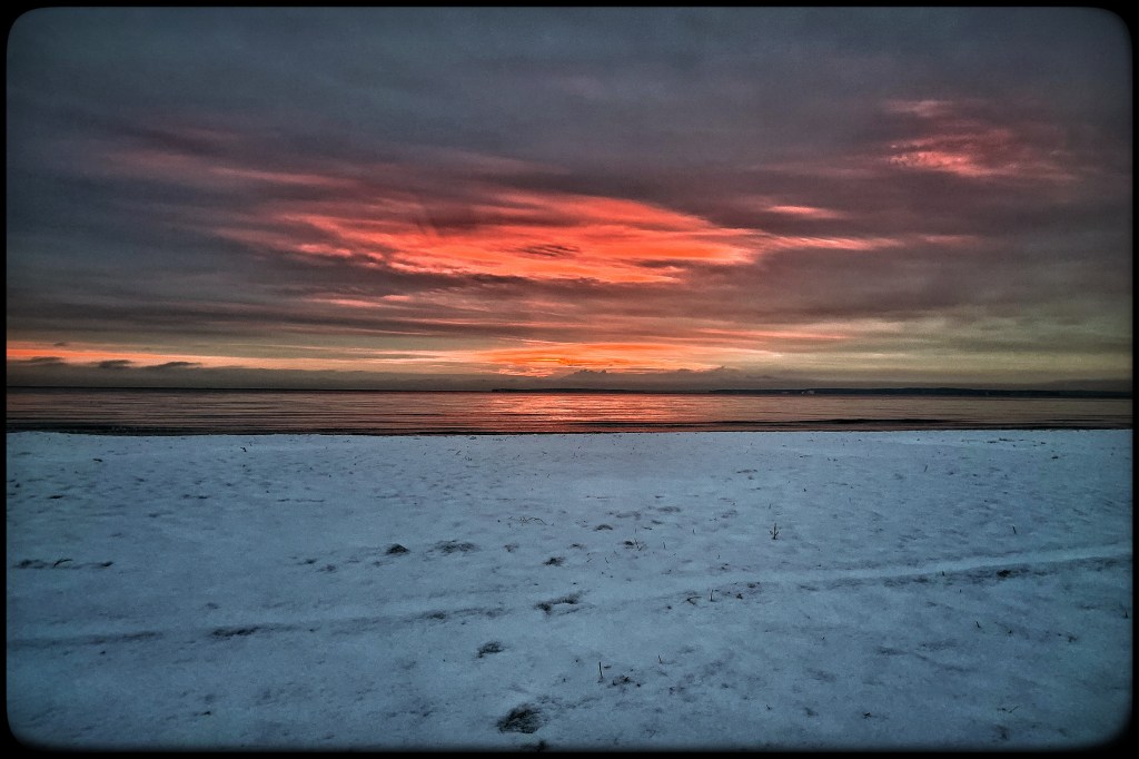 I took a walk there this morning to see what the beach would look like after last night’s snow. I wanted to get there before sunrise (7:09 today), though not expecting much from it because of the clouds. I was fortunate that the skies cleared up enough to get a few decent pictures, though.