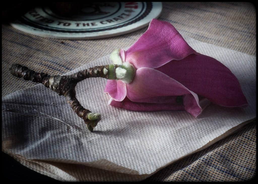 I found her there this morning as I was getting ready to go out for my morning coffee. She was pretty much as I had left her. Though having lost some of her freshness and looking wilted, she was still attractive, interesting, still so full of colour.