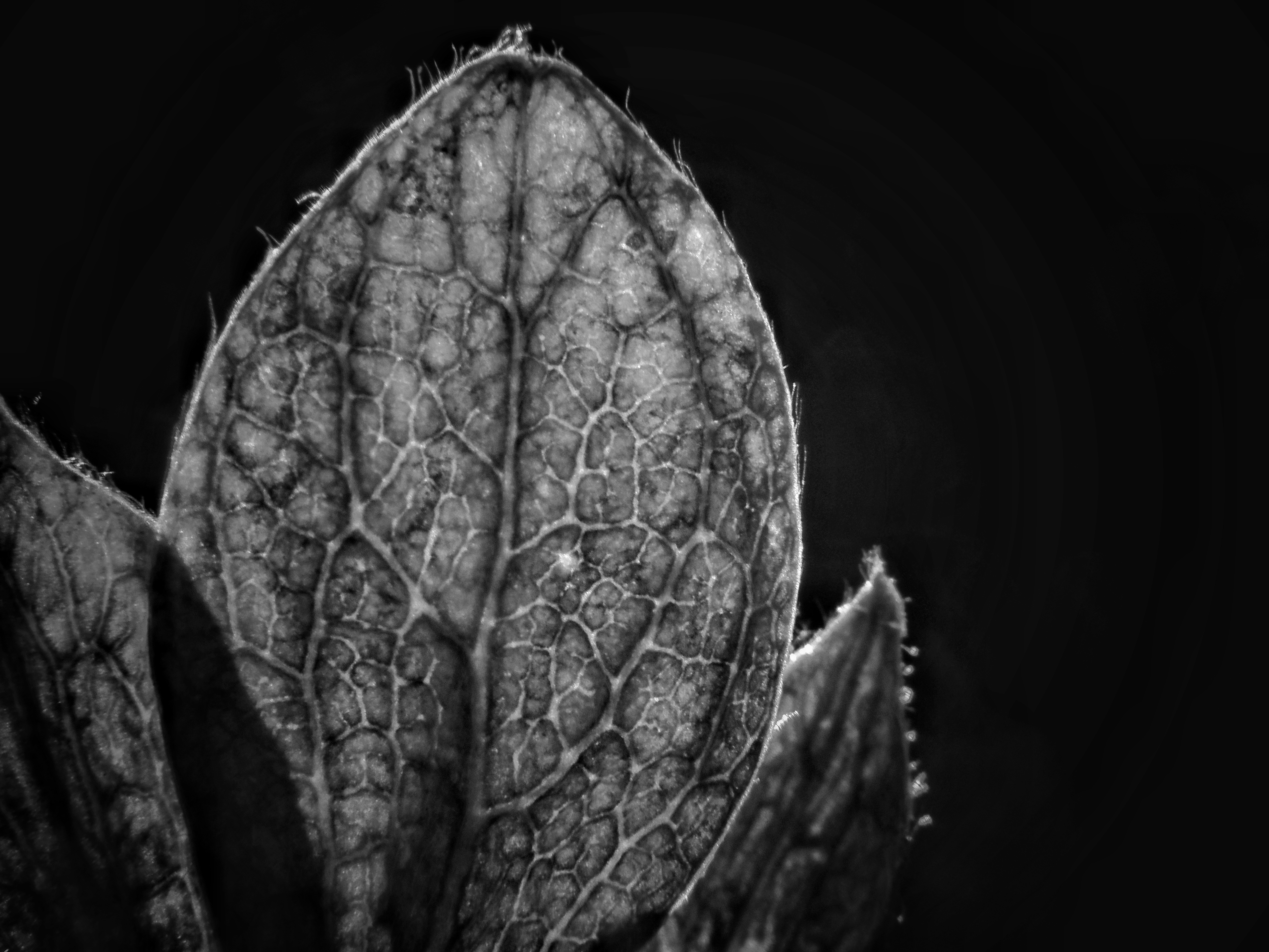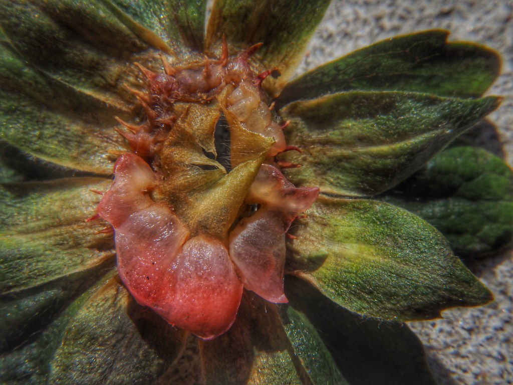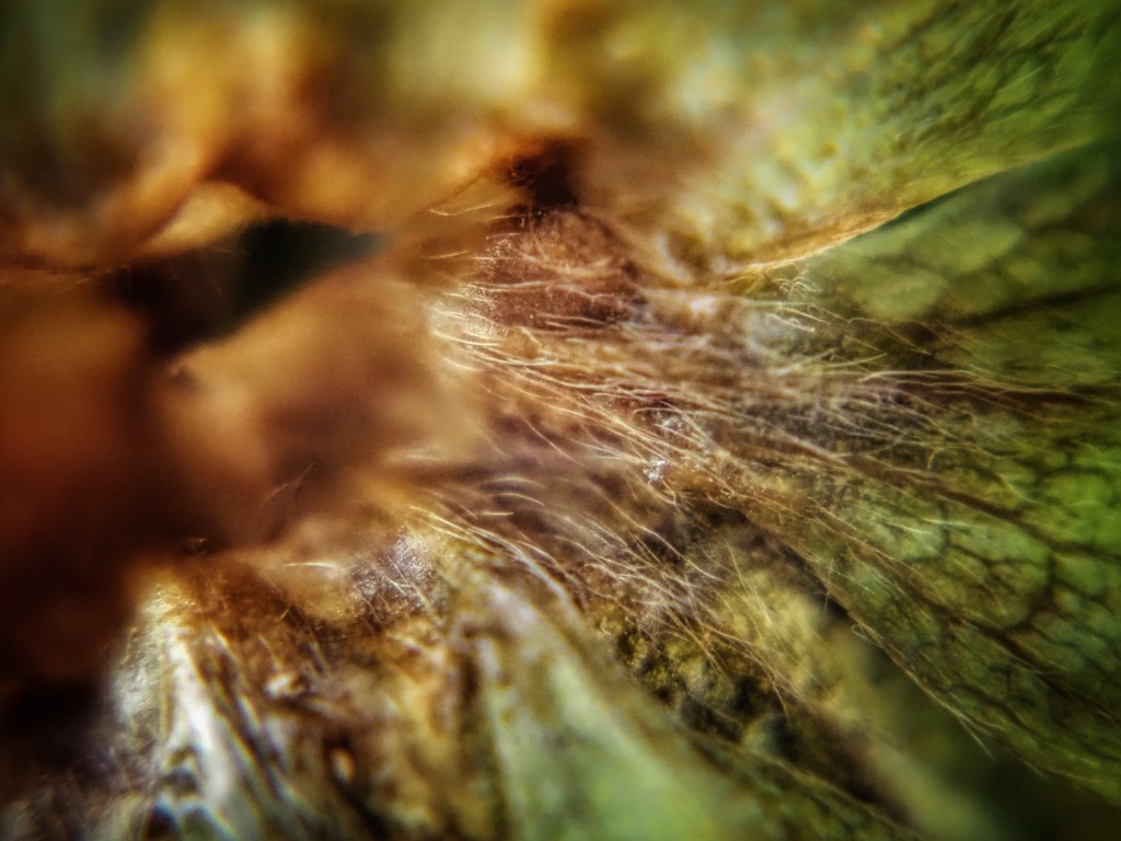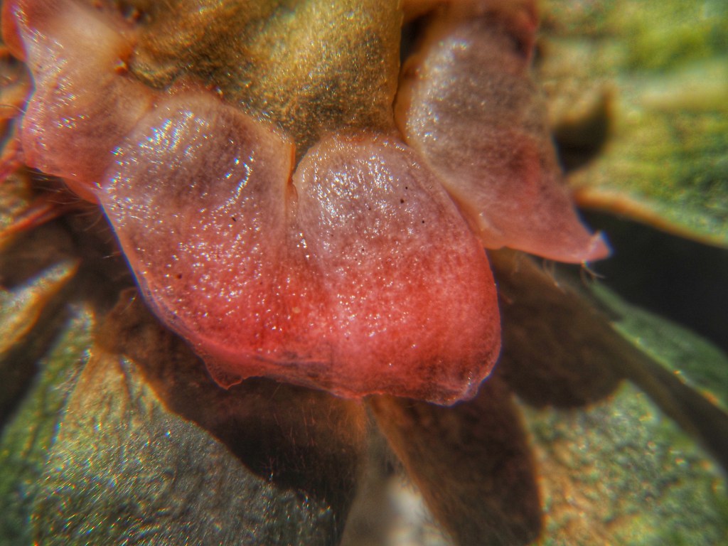 There were a couple of strawberry calyces (caps) in the sink this morning and I got the idea that they might make for some good pictures. It’s a sunny day, so I took one of them out to the stoop where I photographed it using a macro attachment.